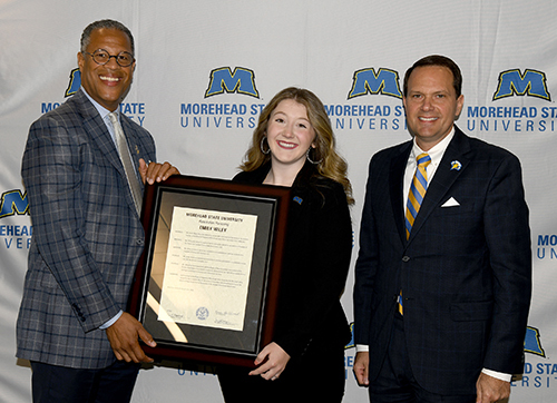 Left photo: Outgoing Student Government Association President Emily Wiley was recognized for her service to MSU during Thursday’s Board of Regents meeting. Pictured from left to right are: Board of Regents Chair Eric Howard, Wiley and MSU president Dr. Jay Morgan.