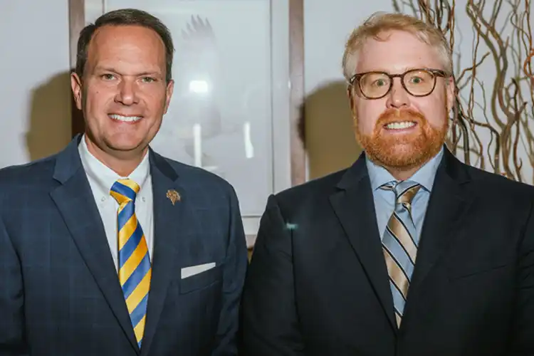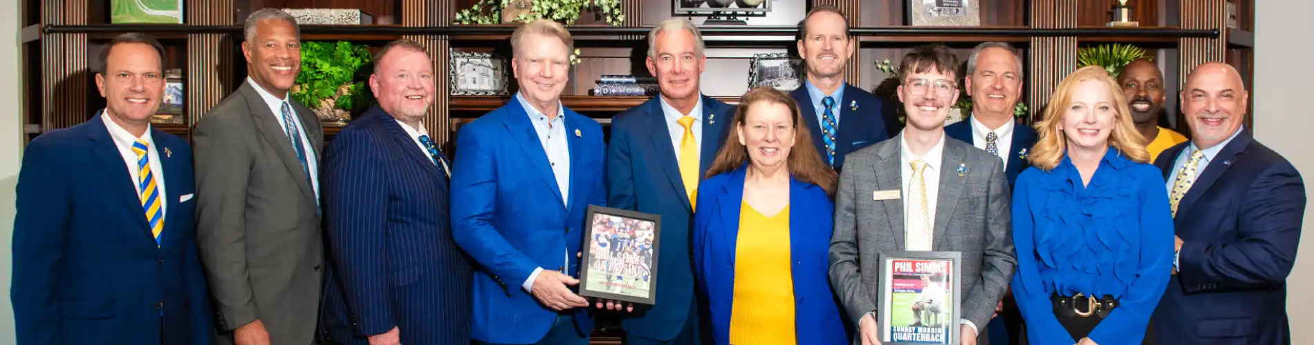 - Left to right: Dr. Jay Morgan, Regent Eric Howard (Class of 1981), Regent Dr. Sanford Holbrook (Class of 1997, 2003, 2006, 2025), Alum and Special Guest Phil Simms (Class of 2015), Regent Arthur Walker, Faculty Regent Dr. Joyce Stubbs (Class of 1979, 1981), Regent John Holbrook (Class of 1991), Student Regent Thomas Clem, Regent Chris McClurg (Class of 1997), Regent Rhonda Blackburn (Class of 1992), Alum and Special Guest Ted Docks (Class of 1998, 2002) and Staff Regent Dr. Joel Pace (Class of 2002, 2004, 2006, 2015, and 2021)
