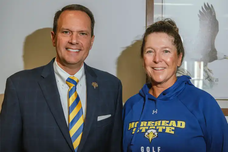 - Left to right: Dr. Jay Morgan and Stephanie Barker, MSU women’s golf head coach, representing the MSU Women’s Golf Team