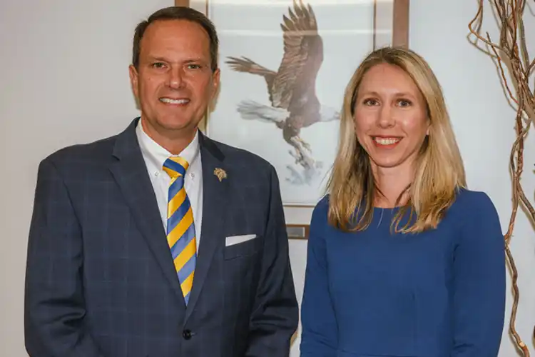 - Left to right: Dr. Jay Morgan and Andrea Stone, J.D. (Class of 2008, 2011), director of procurement services