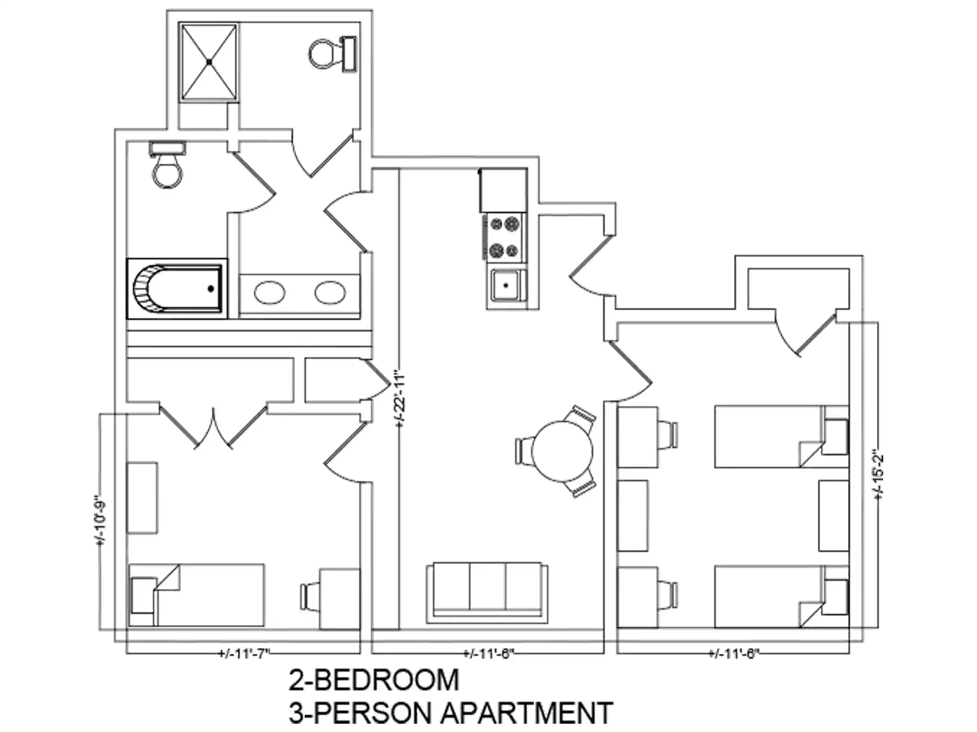 This apartment is divided into one two-person (11' 6" x 15' 2") and one one-person bedroom (10' 9" x 11' 7"), with a private bathroom. A living and dining space in the middle is 22' 11" x 11; 6".