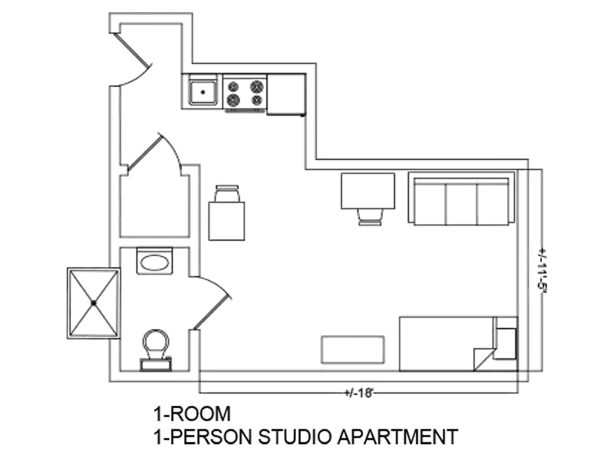 An average one-person apartment is 11' 5" x 18'.