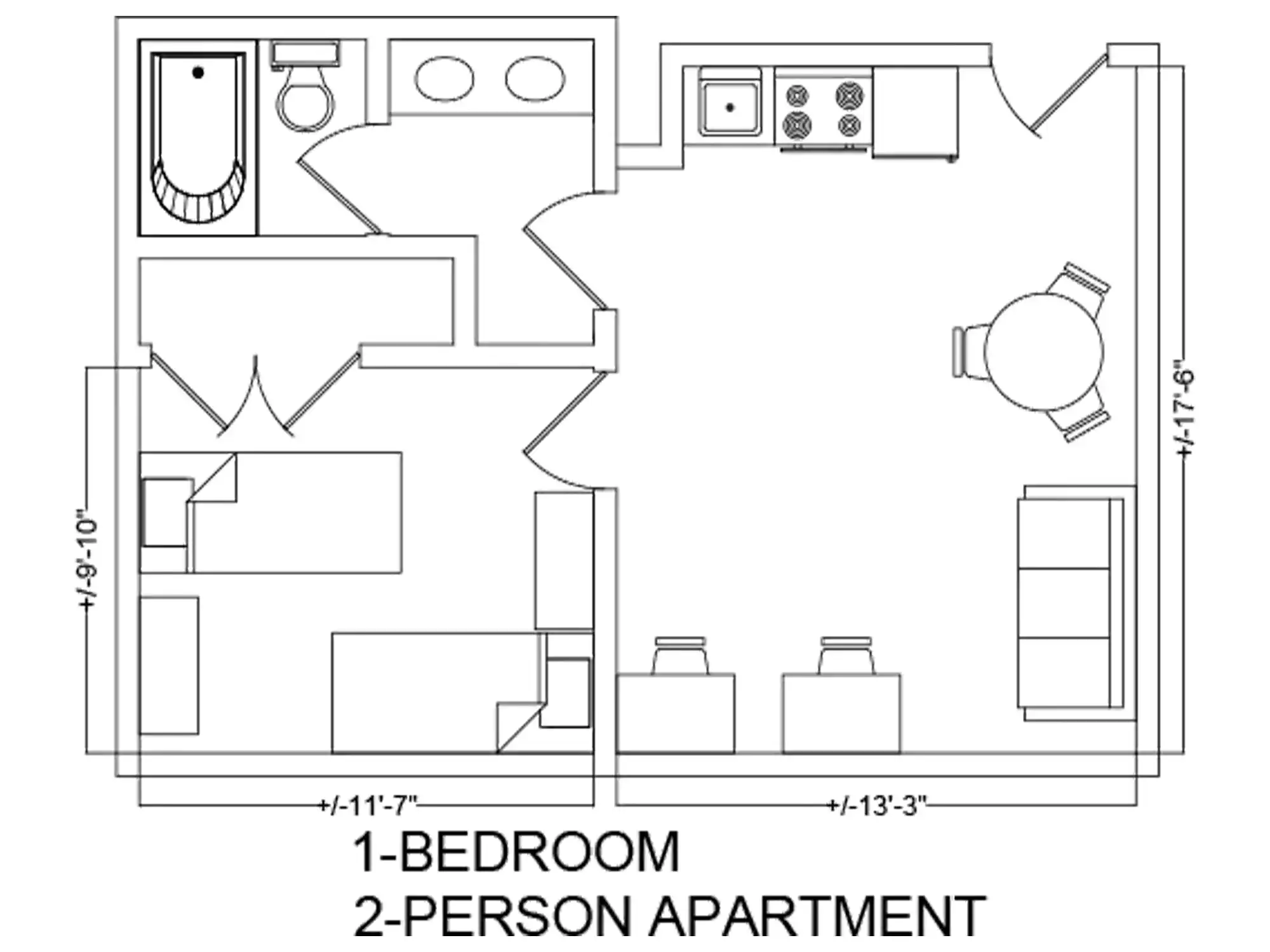 This apartment is divided into a two-person bedroom of 9' 10" x 11' 7 and living area/kitchen of 13' 3 x 17' 6".